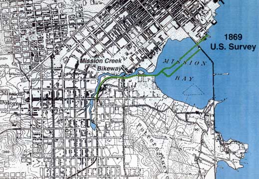 The idea for the San Francisco Mission Creek Bikeway and Greenbelt (MCB) was conceived in 1991 when the Southern Pacific Railroad abandoned the Mission Creek line along Division Street. The remaining swath of continuous open land presented an opportunity to revitalize this historic corridor to meet the changing needs of San Francisco's post-industrial neighborhoods. From the intersection of 16th and Harrison Streets in the Northeast Mission district, along Treat Avenue and Division Street, around and through the 8th and Townsend Circle, to the Caltrain tracks bordering Mission Bay, the abandoned railroad corridor traces the route of the once navigable Mission Creek. In addition to salvaging an important transportation asset, the Bikeway and Greenbelt Project also provides an opportunity to educate the public about the natural drainage hidden beneath the City streets and to promote the environmental stewardship of the San Francisco Bay and Estuary.