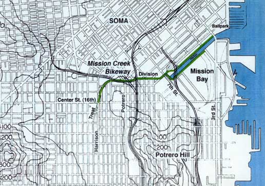 Specifically, the Project's goal is to provide a continuous bicycle/ pedestrian route linking the corner of 16th and Harrison to the bikeway planned along the south side of the Mission Creek Channel, the last remnant of what was once Mission Creek. Between 16th St. and Bryant, modifications are proposed to Treat Ave. including traffic calming, landscaping, and restrictions on through traffic to allow the creation of a "bicycle boulevard." Between Bryant St. and Vermont, a Class I, off street bikeway is proposed along the south side of Division under the Central Freeway, utilizing private land that would need to be acquired via purchase or land trade (see Land Acquisition Strategies, page 38). After Vermont, striped bike lanes, a Class I bikeway and other traffic calming projects are proposed on either side of the 8th and Townsend Circle to De Haro Street. From here, a path through a planned residential development would lead users to a proposed bicycle/ pedestrian bridge crossing both 7th St. and the Caltrain tracks, connecting directly to the planned Mission Creek Park, with its bicycle and pedestrian paths leading to Pac Bell Park and the Embarcadero Promenade.