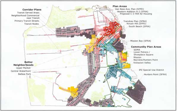 The rapid pace of recent land use changes in the City's southeast quadrant has resulted in concern by citizens and policymakers alike. Better urban planning is needed, to avoid potential conflicts between residential and industrial uses, to preserve land for future development, and to mitigate the consequences of increased density and population. The SF City Planning Department has undertaken a number of long range planning efforts described in their 2002 report "Profiles of Community Planning Areas: San Francisco's Eastern Neighborhoods." Exhibit 5: Citywide Action Plan is taken from this report. The MCB is located in the very center of this redevelopment and planning effort, as can be seen in the exhibits on the following page.