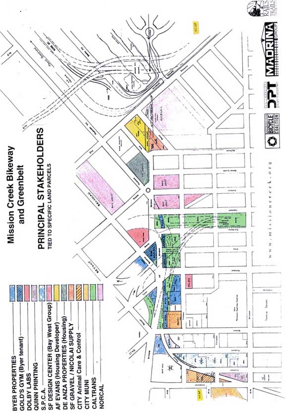 A significant amount of land must be acquired from Byer Properties along Division Street before the Mission Creek Bikeway (MCB) plan can be fully implemented. Fortunately, sufficient publicly owned land exists along the former Mission Creek rail line to compensate (through trade or match) for these acquisitions.