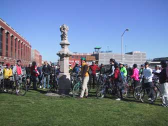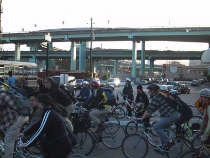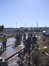 Approximately 50 bicyclists showed up for a tour of Eastern San Francisco's Natural History, which featured a tour of the proposed Mission Creek Bikeway Route, all the way from Pac Bell Park to 16th and Harrison. RTC Project Coordinator Josh Hart gave a presentation about the project and the natural history of the Mission Creek, and oral feedback was solicited. Bicyclists witnessed firsthand the need for a bridge over the Caltrain tracks as they trudged through the mud (see photo below).