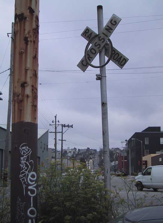 Hints of transportation modes along Mission Creek, both past and future: a remnant of the railroad with a hanging bicycle tire at Division and De Haro